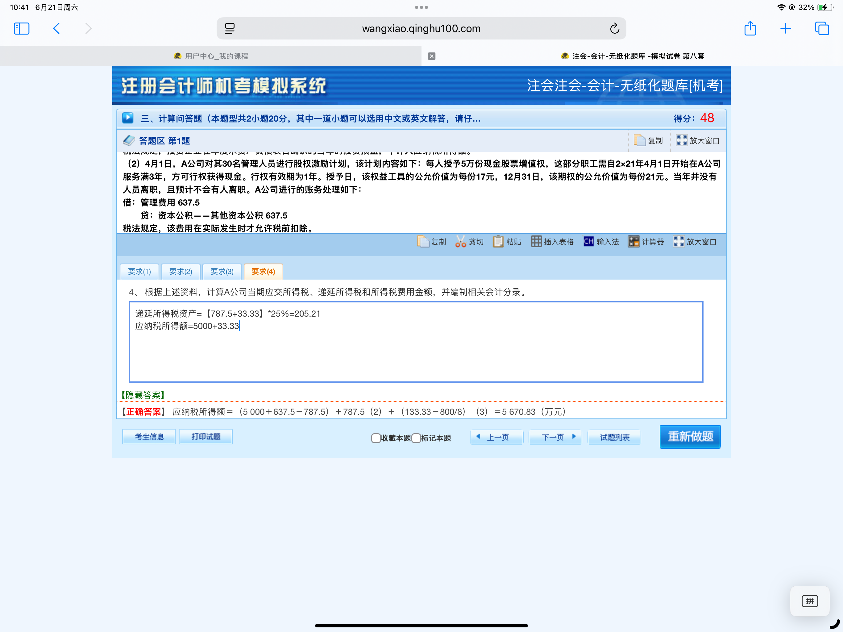 这是因为税法与会计在股份支付费用扣除规则上存在差异,需要通过纳税调整来还原应纳税所得额,具体逻辑如下: 一、会计处理(权益结算股份支付) 对于权益结算的股份支付(如现金股票增值权计划 ),会计上在等待期内按 权益工具的公允价值 分期确认费用(管理费用 ),并计入资本公积,分录(本题简化): 借:管理费用 637.5(等待期分摊的费用 ) 贷:资本公积 —— 其他资本公积 637.5 二、税法处理(实际发生时扣除) 税法规定:股份支付费用只有在实际发生(职工行权,企业支付现金 )时,才允许税前扣除 。 本题中,会计上在等待期(当年 )确认了管理费用 637.5 万元,但税法认为 “费用未实际支付”,不认可当年扣除,因此需要 纳税调增(把会计上扣除的费用加回来 )。 三、应纳税所得额调整逻辑 应纳税所得额 = 会计利润 ± 纳税调整额 会计利润中,已扣除了 “管理费用 637.5 万元”(减少利润 ); 税法不认可当年扣除,需调增应纳税所得额 637.5 万元(因为会计扣多了,要加回来 )。 四、后续行权时的反向调整 当职工未来行权(企业实际支付现金 )时,税法允许扣除,此时会计上无费用确认(已在等待期分摊 ),需 纳税调减(把之前调增的金额扣回来 ),保证费用在 “实际支付年度” 扣除。 简单说,会计按权责发生制提前确认了费用,税法按收付实现制要求 “实际支付才扣”,因此当年要把会计扣除的费用加回,调增应纳税所得额,这就是 “抵消的管理费用要加上” 的核心原因