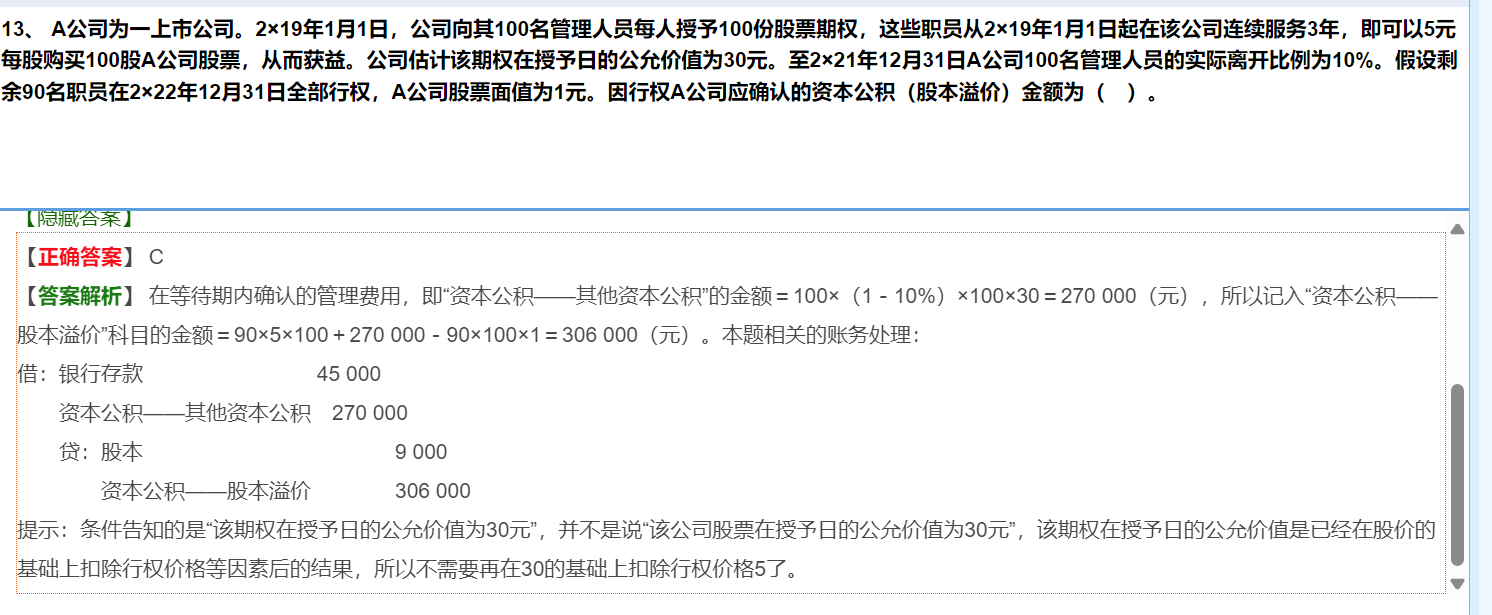 这个30元是整体期权的公允价值,不是股票市价,也不需要再减去5元的行权价。<br><br>---<br><br>相关知识扩充:<br><br>1. 股份支付的公允价值: <br> 在以权益结算的股份支付中,企业应按授予日权益工具的公允价值计量,而不是市场股价或行权价。这里的30元是期权本身的公允价值,已隐含了行权价格的影响。<br><br>2. 为何不扣除行权价? <br> 例如:股票市价40元,行权价5元,期权价值30元。这30元就是买方愿意为获得“未来低价购买股票权利”支付的价格,已经包含了行权价与市价的差额,因此无需再次扣除。这是会计准则(如CAS 11)的核心要求。