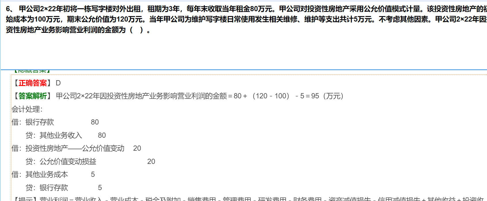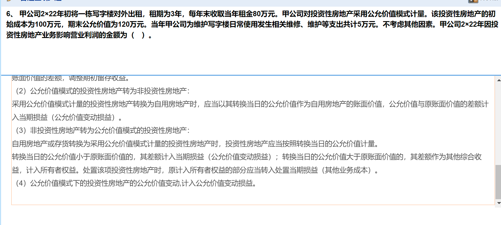 你提到的“非投资性房地产转为公允价值模式的投资性房地产”时,差额计入其他综合收益的情况,是转换日的处理规则。<br><br>但本题中,该写字楼是2×22年初直接对外出租,即从一开始就是作为投资性房地产核算,并且采用公允价值模式。因此,它不是由自用房地产转换而来,而是初始确认为投资性房地产。<br><br>在公允价值模式下,持有期间的公允价值变动(如100万元→120万元)应计入当期损益(公允价值变动损益),而不是其他综合收益。<br><br>所以,这里公允价值增加20万元计入“公允价值变动损益”,是正确的。<br><br>✅ 总结: <br>- 若是转换日从自用转投资性房地产,公允价值大于账面价值 → 计入“其他综合收益”。 <br>- 若是持有期间公允价值变动 → 直接计入“公允价值变动损益”。 <br><br>本题属于后者,故计入当期损益。
