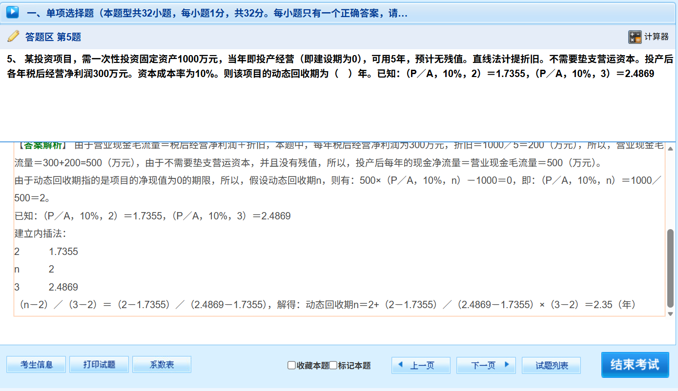 首页 > 全部问答 > 动态回收期n=2+(2-1.7355)/(2.4869-1.7355)×(3-2)=2.35