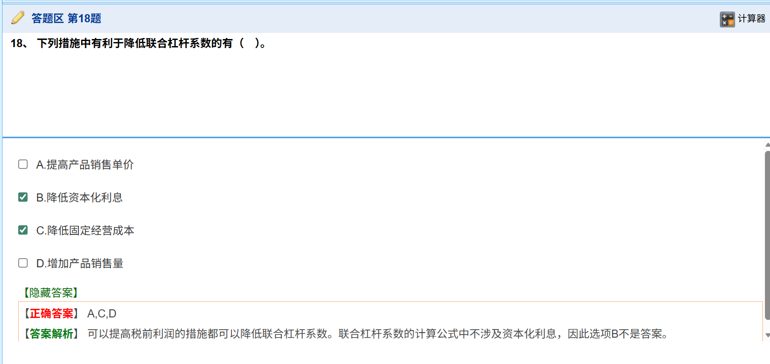 选项D:增加产品销售量Q 销量Q增加→边际贡献M(分子)增加,同时EBIT也增加,分母的增长幅度依然大于分子,最终DTL降低(逻辑和提高单价一致,可参考上面的例子替换Q数值验证)。