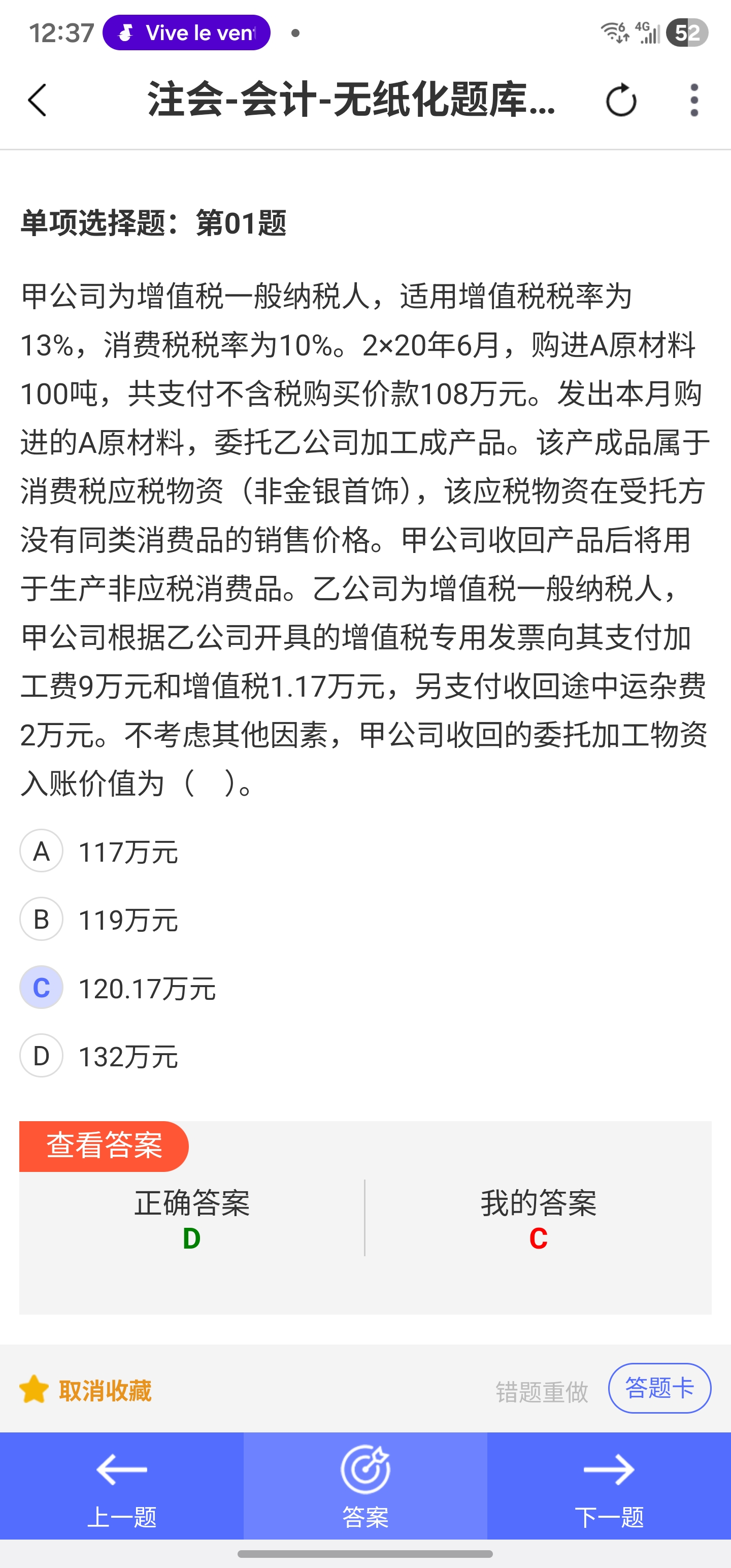首先,**增值税**:加工费的增值税=9×13%=1.17万元(可抵扣,不计入成本)。 其次,**消费税**:受托方无同类价,按组成计税价格计算。组成计税价格=(材料成本+加工费)÷(1-消费税税率)=(108+9)÷(1-10%)=130万元,消费税=130×10%=13万元(因收回后用于生产非应税消费品,消费税计入成本)。 委托加工物资入账价值=108(材料)+9(加工费)+13(消费税)+2(运杂费)=132万元。