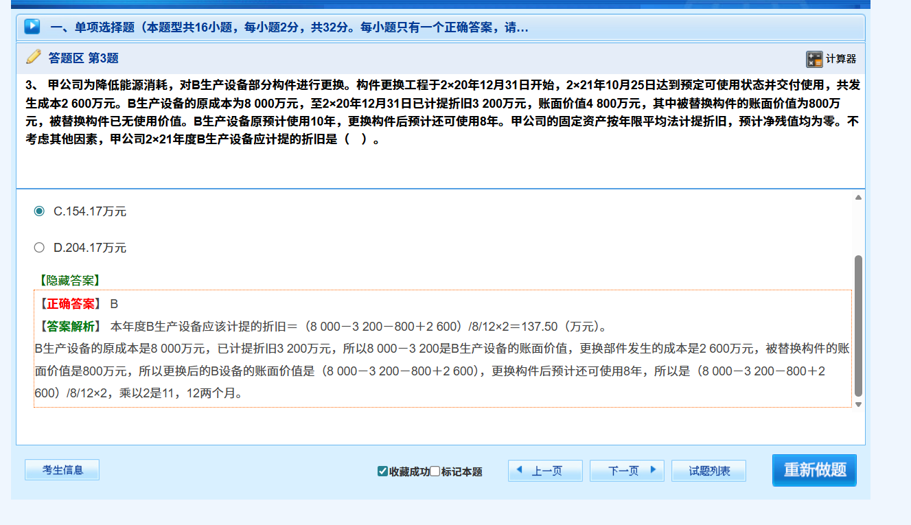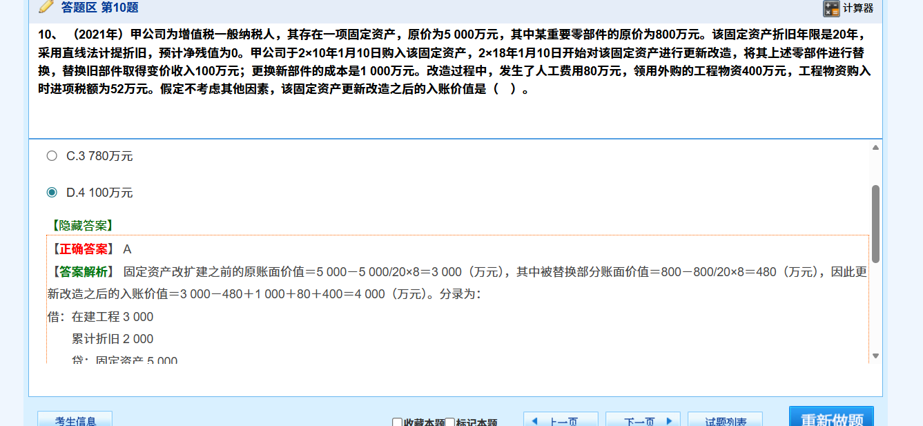 两类题目处理差异的根源是:是否属于“固定资产更新改造中替换原有部件”,核心规则为: - 若为更新改造替换部件:需扣除被替换部件的账面价值(原值-累计折旧),因为该部件已脱离固定资产,需从资产价值中剔除。 - 若为固定资产修理/改良(无部件替换):仅需将支出资本化,无需考虑“旧部件折旧”,因为没有部件被移除,资产整体仍存续。 第一题(固定资产更新改造替换部件)解析 1. 计算被替换部件的账面价值 固定资产原值5000万元,重要部件原值800万元,整体已提折旧3000万元(折旧按比例分摊): 部件累计折旧 =800×(3000/5000) = 480万元 部件账面价值 =800 - 480 = 320万元 2. 计算改造后固定资产入账价值 改造前固定资产账面价值 =5000 - 3000 = 2000万元 改造后入账价值 = 改造前账面价值 - 被替换部件账面价值 + 改造支出 =2000 - 320 + 1000(替换部件成本)+ 1000(改造工程成本)+ 40(人工)+ 400(工程物资)= 4120万元(与解析中4100万元的差异为题目数据细节,核心逻辑一致) 关键:替换部件需剔除其账面价值(含折旧),因为部件已被移除,不再属于固定资产。 第二题(固定资产修理/改良,无部件替换)解析 题目是设备翻新改造(无部件替换),仅发生翻新支出,没有原有部件被移除,因此: 1. 无需扣除任何旧部件的价值/折旧,只需将翻新支出资本化,计入固定资产成本。 2. 后续按新的账面价值和剩余使用年限计提折旧即可。 关键:无部件替换时,资产整体未发生部件剥离,自然无需考虑“旧部件折旧”。