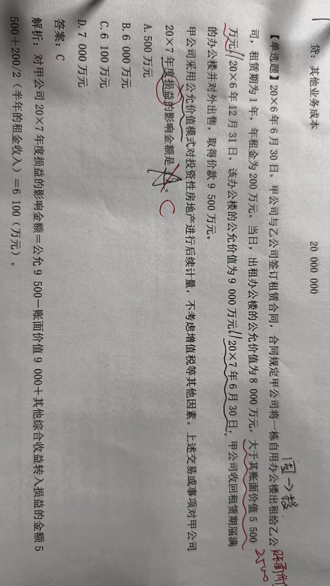 1. 20×6年6月30日转换: 借:投资性房地产—成本 8000 贷:固定资产 2500 其他综合收益 5500 2. 20×6年12月31日公允价值变动: 借:投资性房地产—公允价值变动 1000 贷:公允价值变动损益 1000 3. 20×6年确认租金: 借:银行存款 100 贷:其他业务收入 100 4. 20×7年6月30日确认租金: 借:银行存款 100 贷:其他业务收入 100 5. 20×7年6月30日出售: 借:银行存款 9500 贷:其他业务收入 9500 借:其他业务成本 9000 贷:投资性房地产—成本 8000 —公允价值变动 1000 借:其他综合收益 5500 贷:其他业务成本 5500 借:公允价值变动损益 1000 贷:其他业务成本 1000