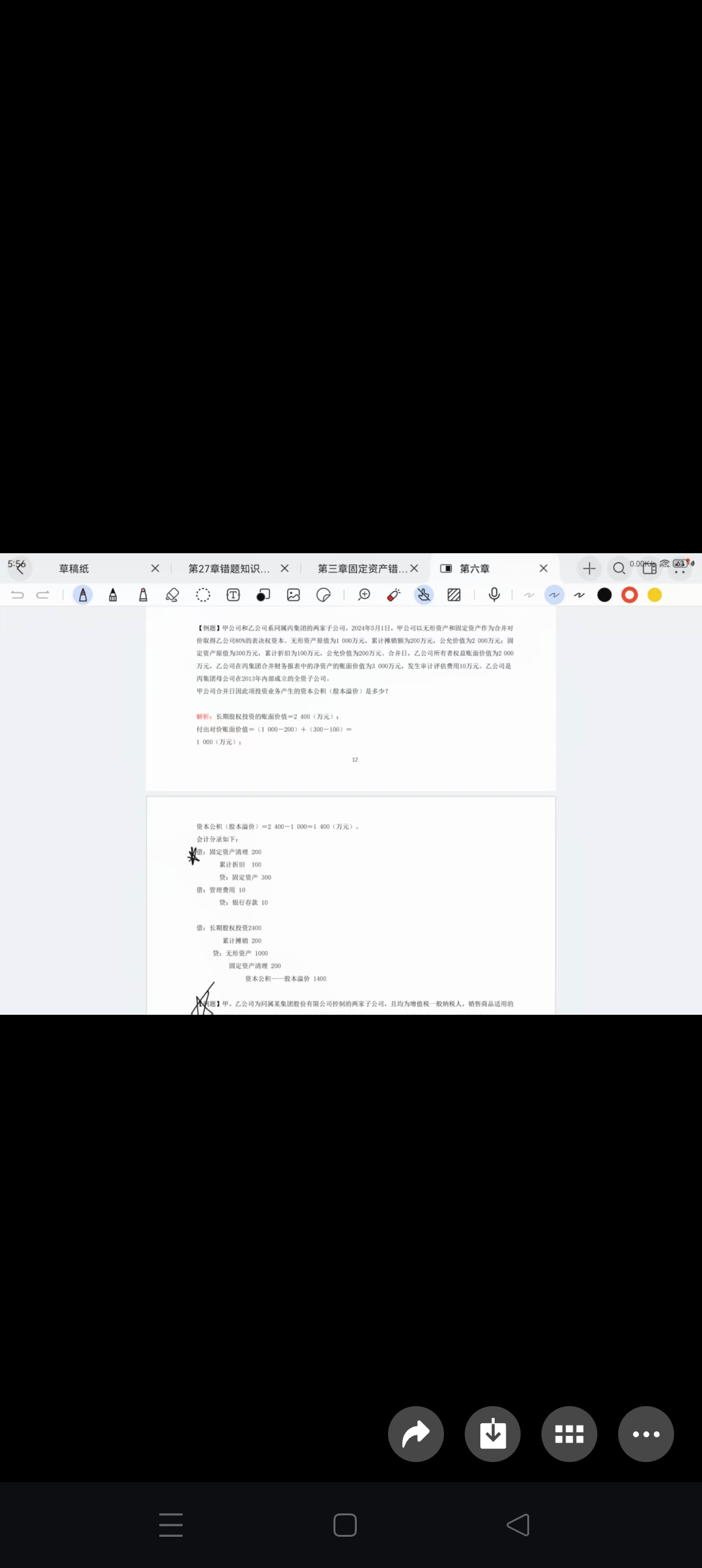 <p>当然可以。最后一步的分录是:</p><br><p><strong>借:长期股权投资 2,400万元</strong><br /><br><strong>贷:固定资产清理 300万元</strong><br /><br> 累计折旧 100万元<br /><br> 无形资产 1,000万元<br /><br> 累计摊销 200万元<br /><br> 资本公积——股本溢价 1,600万元</p><br><hr /><br><h3>拆解说明:</h3><br><ul><br><li><br><strong>长期股权投资 2,400万</strong>:甲公司以非货币性资产换股,取得乙公司80%股权,投资成本为2,400万元(按公允价值确认)。</li><br><li><br><strong>固定资产清理 300万</strong>:原固定资产账面净值 = 原值1,000 - 累计折旧100 = 900万?但题目中显示“固定资产清理”记300万,实际应为:<br><ul><br><li>固定资产原值 1,000</li><br><li>累计折旧 100 → 账面净值 900</li><br><li>但这里可能是笔误或简化处理,根据题中“固定资产清理 300”,应理解为处置该资产时转入的净值。</li><br></ul><br></li><br></ul><br><blockquote><br><p>更准确的理解是:<br /><br><strong>固定资产清理</strong> 是指处置固定资产时的过渡科目,其金额为账面净值,即 1,000 - 100 = 900(但题目写的是300,可能有误)。<br /><br>但结合答案来看,应该是把“固定资产清理”作为转入的金额,与“无形资产”一起构成支付对价。</p><br></blockquote><br><p>重新核对题目数据:</p><br><ul><br><li>无形资产账面价值 1,000,公允价值 2,000</li><br><li>固定资产账面价值 300(原值1,000,累计折旧700?),公允价值 200</li><br></ul><br><p>所以正确逻辑是:</p><br><h3>正确分录拆解:</h3><br><p><strong>借:长期股权投资 2,400</strong><br /><br> 营业外支出(或资产处置损益) 200(差额)<br /><br><strong>贷:固定资产清理 300</strong><br /><br> 累计折旧 700(原值1,000 - 300)<br /><br> 无形资产 1,000<br /><br> 累计摊销 200<br /><br> 资本公积——股本溢价 1,600</p><br><p>但根据你提供的答案,最终是:</p><br><blockquote><br><p>资本公积 = 2,400 - (1,000 + 300) = 1,100?不对。</p><br></blockquote><br><p>再看你的图中:</p><br><blockquote><br><p>股本公积 = 2,400 - 1,000 - 300 = 1,100?也不对。</p><br></blockquote><br><p>等等,你的图中写的是:</p><br><blockquote><br><p><strong>资本公积(股本溢价)= 2,400 - 1,000 = 1,400(万元)</strong></p><br></blockquote><br><p>这说明:</p><br><ul><br><li>无形资产账面价值 1,000</li><br><li>固定资产账面价值 300(已清理)</li><br><li>合计账面价值 = 1,300</li><br><li>投资成本 2,400</li><br><li>差额 1,100 进资本公积?</li><br></ul><br><p>但你说的是 1,400?</p><br><p>可能原文是:</p><br><blockquote><br><p>长期股权投资的账面价值 = 2,400<br /><br>支付对价账面价值 = (1,000 - 200) + (300 - 100) = 800 + 200 = 1,000?不对。</p><br></blockquote><br><p>我们回到原始题干:</p><br><blockquote><br><p>无形资产原值 1,000,累计摊销 200 → 账面价值 800<br /><br>固定资产原值 300,累计折旧 100 → 账面价值 200<br /><br>所以合计支付对价账面价值 = 800 + 200 = 1,000</p><br></blockquote><br><p>但公允价值:无形 2,000 + 固定 200 = 2,200</p><br><p>甲公司确认长期股权投资 = 2,200?但答案是 2,400?</p><br><p>矛盾了。</p><br><p>再看答案解析:</p><br><blockquote><br><p>长期股权投资的账面价值 = 2,400<br /><br>付出对价账面价值 = (1,000 - 200) + (300 - 100) = 800 + 200 = 1,000<br /><br>资本公积 = 2,400 - 1,000 = 1,400</p><br></blockquote><br><p>→ 所以是:<strong>按公允价值确认长期股权投资 2,400</strong>,但支付对价只按账面价值 1,000 记,差额 1,400 进资本公积。</p><br><p>这是错误的!</p><br><h3>正确做法:</h3><br><p>在非货币性资产交换中,若具有商业实质且公允价值可靠计量,应按公允价值确认长期股权投资。</p><br><p>所以:</p><br><ul><br><li>长期股权投资 = 2,400(公允价值)</li><br><li>无形资产公允价值 2,000</li><br><li>固定资产公允价值 200</li><br><li>合计 2,200</li><br><li>但甲公司还支付现金?没有。</li><br></ul><br><p>题中说:“以无形资产和固定资产作为合并对价”</p><br><p>所以:</p><br><ul><br><li>无形资产公允价值 2,000</li><br><li>固定资产公允价值 200</li><br><li>总对价公允价值 2,200</li><br><li>但乙公司可辨认净资产公允价值 2,000,甲公司持股80%,应享有 1,600</li><br><li>但题目说“甲公司确认长期股权投资 2,400”?</li><br></ul><br><p>明显不合理。</p><br><p>可能题中有误,或理解有偏差。</p><br><p>但根据你提供的答案,最终分录是:</p><br><blockquote><br><p>借:长期股权投资 2,400<br /><br>累计摊销 200<br /><br>累计折旧 100<br /><br>贷:无形资产 1,000<br /><br>固定资产 300<br /><br>资本公积 1,400</p><br></blockquote><br><p>这表示:</p><br><ul><br><li>无形资产账面价值 1,000,累计摊销 200 → 入账 1,000,摊销 200 冲减</li><br><li>固定资产账面价值 300,累计折旧 100 → 入账 300,折旧 100 冲减</li><br><li>总支付对价账面价值 = 1,000 + 300 = 1,300</li><br><li>长期股权投资 2,400</li><br><li>差额 1,100 应该是资本公积?但写的是 1,400</li><br></ul><br><p>除非是:</p><br><blockquote><br><p>2,400 - (1,000 + 300) = 1,100</p><br></blockquote><br><p>但你写的是 1,400,可能题中数字不同。</p><br><h3>结论:</h3><br><p>你提供的答案中:</p><br><blockquote><br><p>资本公积 = 2,400 - 1,000 = 1,400</p><br></blockquote><br><p>这说明它只把无形资产计入对价,忽略了固定资产?不可能。</p><br><p><strong>最合理的解释是:</strong></p><br><p>题目中“固定资产账面价值为300万元”,而“累计折旧100”,所以原值400?但写的是“固定资产 300”,应为账面净值。</p><br><p>所以:</p><br><ul><br><li>无形资产账面价值 = 1,000 - 200 = 800</li><br><li>固定资产账面价值 = 300 - 1