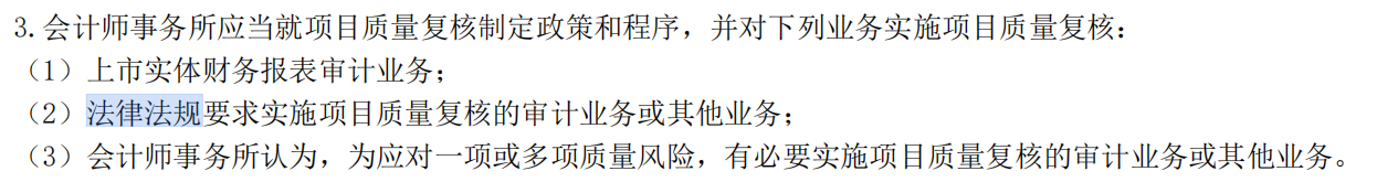 <br /><br>该条款体现的是事务所基于风险判断主动实施复核的职责,而非仅限于法定或上市实体要求。<br /><br>因此,即使审计证据充分、程序有力,若涉及公众利益重大或风险较高,仍“应”实施复核,以满足质量控制的审慎性要求。</p><br>