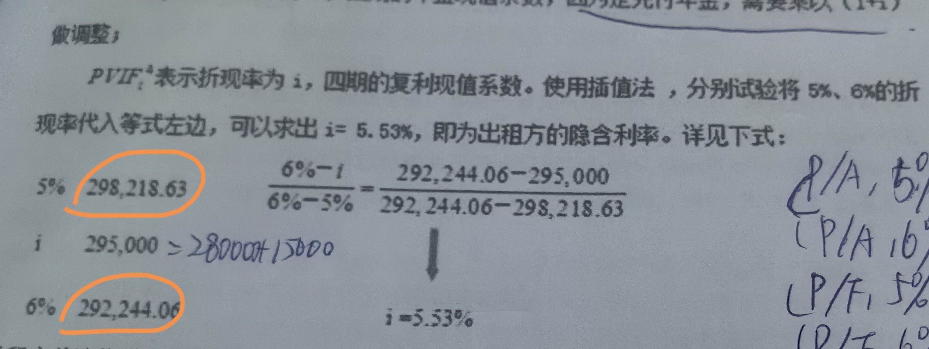 这是融资租赁出租人内含利率的插值法计算,核心等式是:租赁投资净额 = 租金现值 + 未担保余值现值即:295,000=28,000×(P/A,i,4)+15,000×(P/F,i,4) 28,000:每年租金(预付年金,所以现值系数要乘 (1+i)) 15,000:第 4 年末未担保余值 295,000:租赁投资净额(等式右边目标值) 二、计算 5% 时的现值(298,218.63) 预付年金现值系数:(P/A,5%,4)预付=(P/A,5%,4)×(1+5%)=3.5460×1.05=3.7233租金现值:28,000×3.7233=104,252.4 复利现值系数:(P/F,5%,4)=0.8227未担保余值现值:15,000×0.8227=12,340.5 合计现值(5% 时):104,252.4+12,340.5=298,218.63 三、计算 6% 时的现值(292,244.06) 预付年金现值系数:(P/A,6%,4)预付=(P/A,6%,4)×(1+6%)=3.4651×1.06=3.6730租金现值:28,000×3.6730=102,844 复利现值系数:(P/F,6%,4)=0.7921未担保余值现值:15,000×0.7921=11,881.5 合计现值(6% 时):102,844+11,881.5=292,244.06 四、插值法求 i 因为 5% 时现值 > 295,000,6% 时现值 < 295,000,所以利率在 5%~6% 之间:6%−5%6%−i=292,244.06−298,218.63292,244.06−295,000解得:i=5.53%