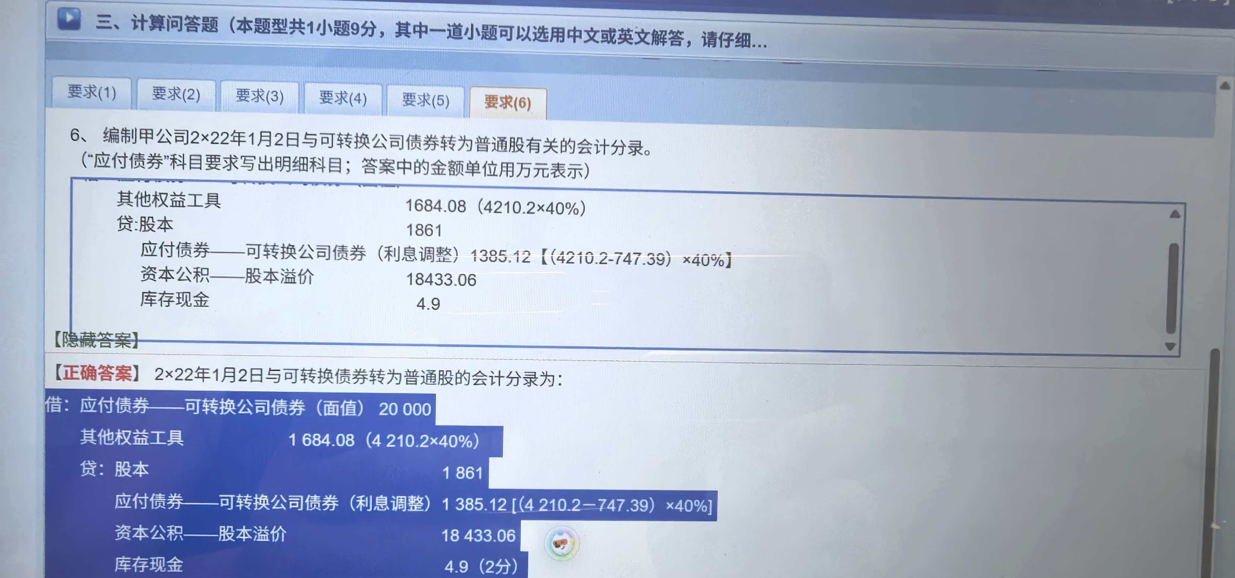 <p>这道题是关于<strong>可转换公司债券转股</strong>的会计处理。关键点在于:可转换债券包含“债务成分”和“权益成分”,转股时需将原计入负债和权益的部分分别结转。</p><br><hr /><br><h3>一、为什么出现“资本公积——股本溢价”?</h3><br><p>因为:</p><br><ul><br><li>可转换债券发行时,其<strong>权益成分</strong>(即未来可能转股部分)已计入“其他权益工具”。</li><br><li>当债券实际转股时,这部分权益要转入“资本公积——股本溢价”,作为股东权益的一部分。</li><br><li>同时,<strong>面值部分</strong>转入“股本”,<strong>账面余额超过股本的部分</strong>进入“资本公积——股本溢价”。</li><br></ul><br><hr /><br><h3>二、分录解析(单位:万元)</h3><br><pre><code class="language-text">借:应付债券——可转换公司债券(面值) 20,000<br> 其他权益工具 1,684.08<br>贷:股本 1,861<br> 应付债券——可转换公司债券(利息调整) 1,385.12<br> 资本公积——股本溢价 18,433.06<br> 库存现金 4.9<br></code></pre><br><h4>各科目来源说明:</h4><br><ol><br><li><br><p><strong>应付债券——面值 20,000</strong><br /><br>是债券的票面金额,转股时需冲销。</p><br></li><br><li><br><p><strong>其他权益工具 1,684.08</strong><br /><br>原发行时确认的权益成分 = 4210.2 × 40%(转股比例),表示投资者购买债券时附带的“转股权”价值。</p><br></li><br><li><br><p><strong>应付债券——利息调整 1,385.12</strong><br /><br>是累计摊销后的利息调整余额 = (4210.2 - 747.39) × 40%,反映未摊销完的折价或溢价。</p><br></li><br><li><br><p><strong>股本 1,861</strong><br /><br>按转股价格计算的普通股面值总额。</p><br></li><br><li><br><p><strong>资本公积——股本溢价 18,433.06</strong><br /><br>是转股时产生的溢价,来源于:</p><br><ul><br><li>面值与股本差额 + 其他权益工具 + 利息调整冲减后剩余部分<br /><br>即:20,000 + 1,684.08 - 1,385.12 - 1,861 - 4.9 = 18,433.06</li><br></ul><br></li><br><li><br><p><strong>库存现金 4.9</strong><br /><br>转股过程中可能支付的手续费或现金补偿,小金额。</p><br></li><br></ol><br><hr /><br><h3>三、核心逻辑总结:</h3><br><blockquote><br><p><strong>可转债转股 = 债务清偿 + 权益转化</strong><br /><br>所有原计入“应付债券”和“其他权益工具”的金额都要结转到“股本”和“资本公积”,差额计入“股本溢价”。</p><br></blockquote><br><p>所以,“资本公积——股本溢价”是<strong>转股过程中形成的资本溢价</strong>,属于股东权益增加,必须体现。</p><br>