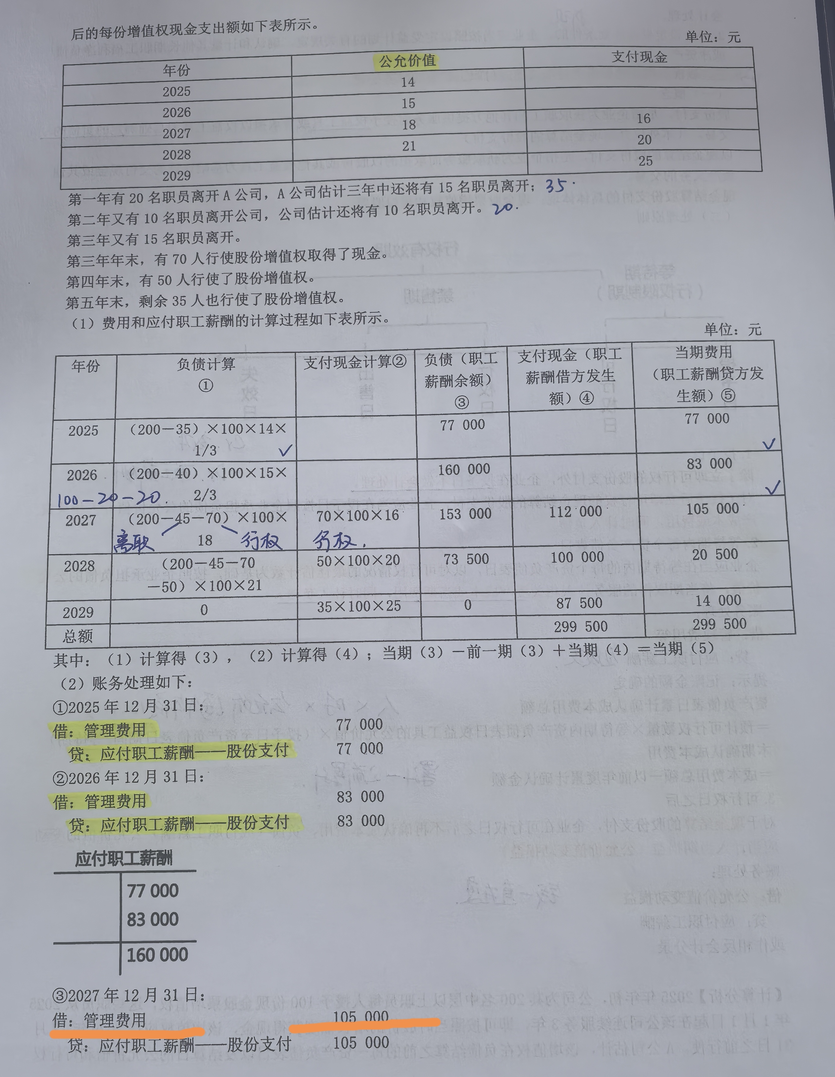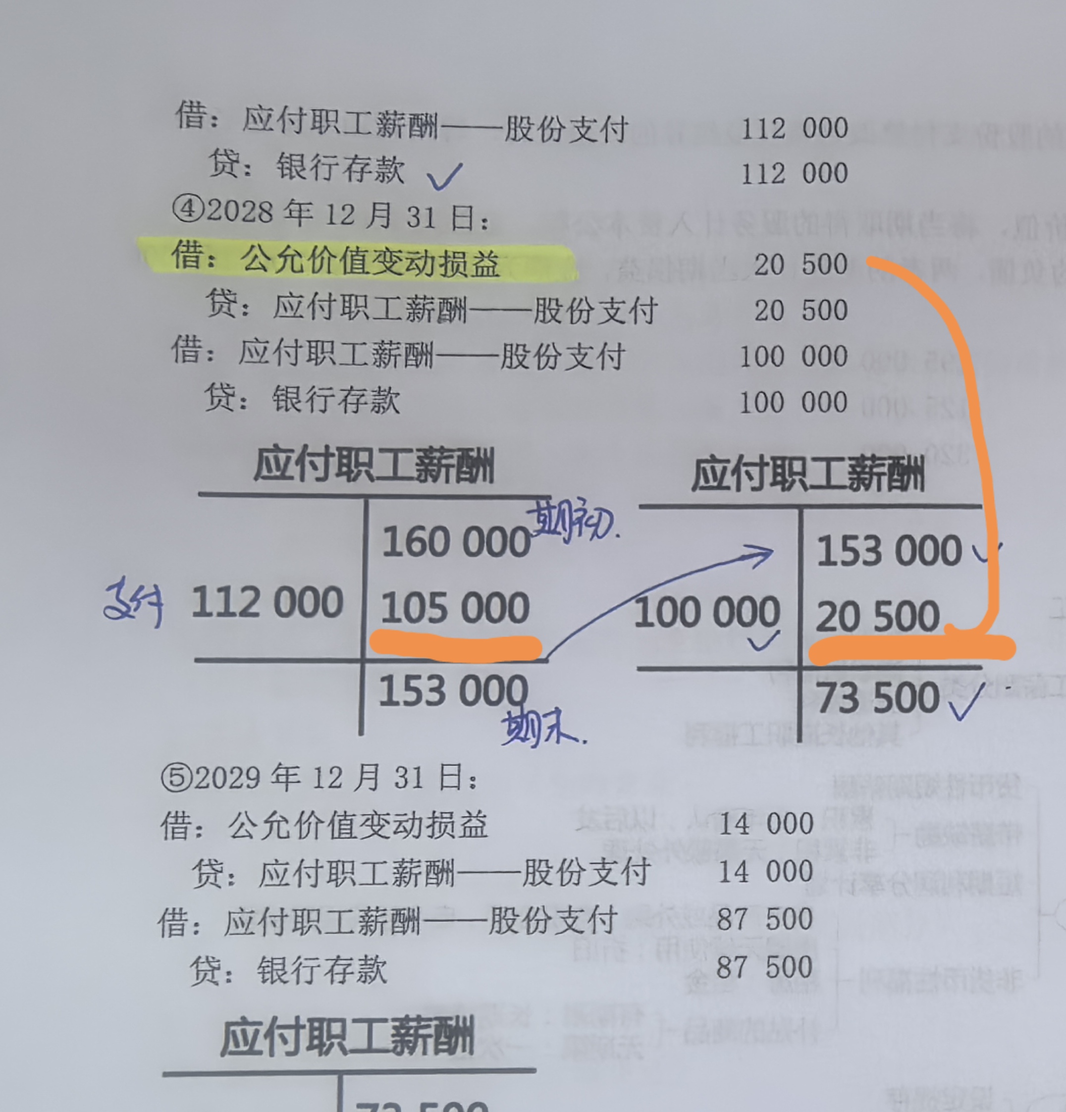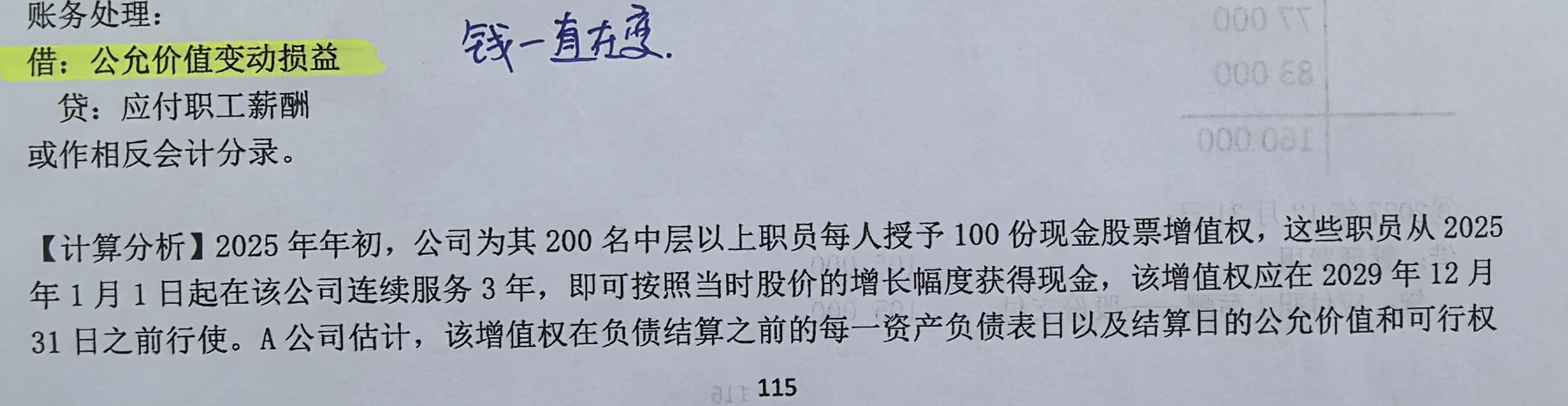 <p>105,000 是 <strong>2027年确认的当期费用</strong>,属于服务期间的职工薪酬成本,计入“管理费用”;<br /><br>20,500 是 <strong>2028年公允价值变动产生的损益调整</strong>,因负债公允价值上升导致应付职工薪酬增加,计入“公允价值变动损益”。<br /><br>二者性质不同:前者是服务成本,后者是公允价值波动。</p><br>