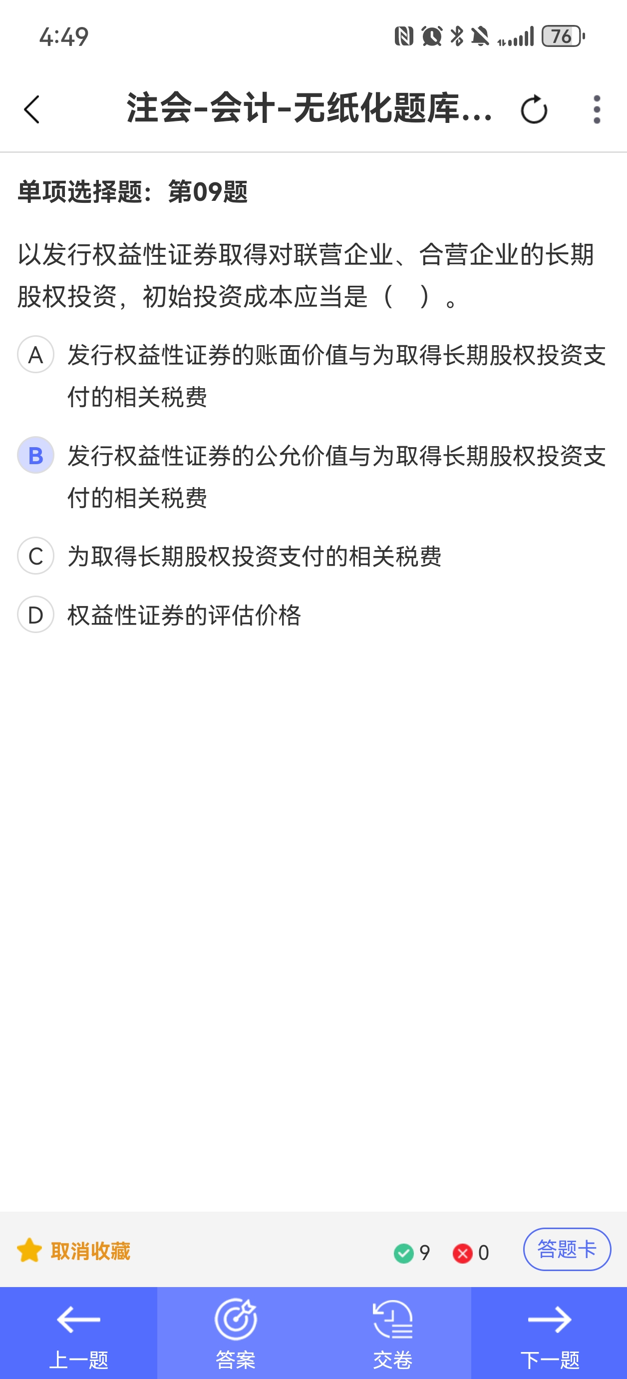 <p>这题选 <strong>B</strong> 是因为:<br /><br>以发行权益性证券取得长期股权投资,<strong>初始投资成本=发行证券的公允价值 + 相关税费</strong>。</p><br><p>但注意:</p><br><ul><br><li><br><strong>支付给券商的直接相关费用(如手续费)不计入投资成本</strong>,而是冲减资本公积或盈余公积;</li><br><li>但<strong>为取得投资支付的相关税费(如印花税等)应计入初始成本</strong>。</li><br></ul><br><p>所以正确答案是 <strong>B</strong>:公允价值 + 相关税费(指非券商服务费的税费),而“交给证券公司的钱”属于发行费用,不算成本。</p><br>