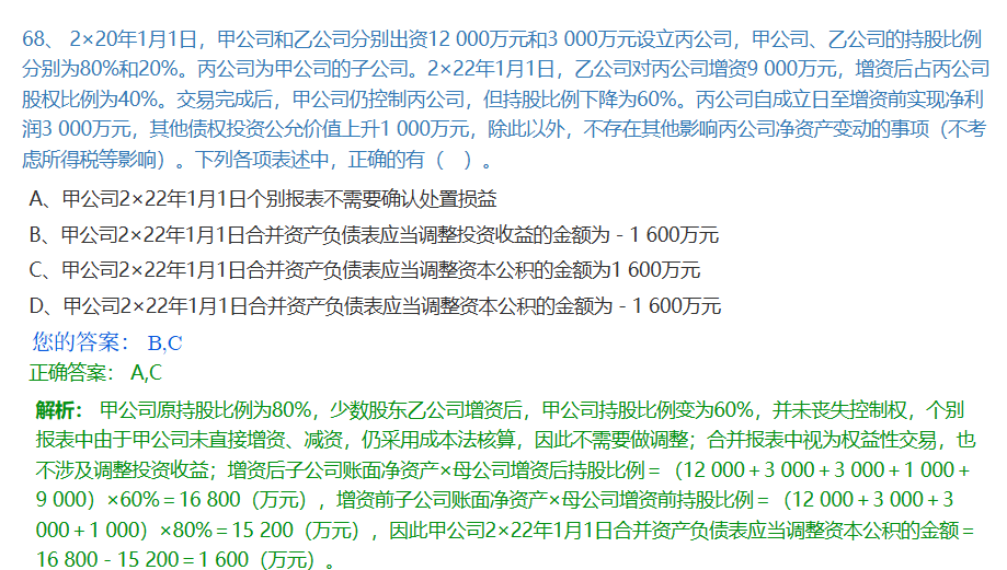 <p>甲公司个别报表中,乙公司增资属于子公司少数股东增资,甲公司未参与,也未处置股权,因此<strong>不确认处置损益</strong>,无需做会计分录。</p><br><p><strong>结论:个别报表不做任何处理。</strong></p><br><p>解析:因为甲公司持股比例下降但未丧失控制权,且未直接出资或转让股权,所以既不确认投资收益,也不调整长期股权投资,个别报表保持原账面价值不变。</p><br>
