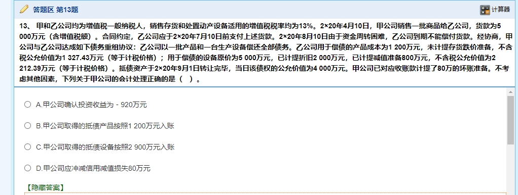 你好,甲公司的投资收益= 4000 - (5000 - 80)= 4000 - 4920= -920 万元,甲公司取得的抵债资产应该按照公允价值入账,选项BC不正确,甲公司损益全部计入投资收益,不应冲减资产减值损失,选项D不正确。
