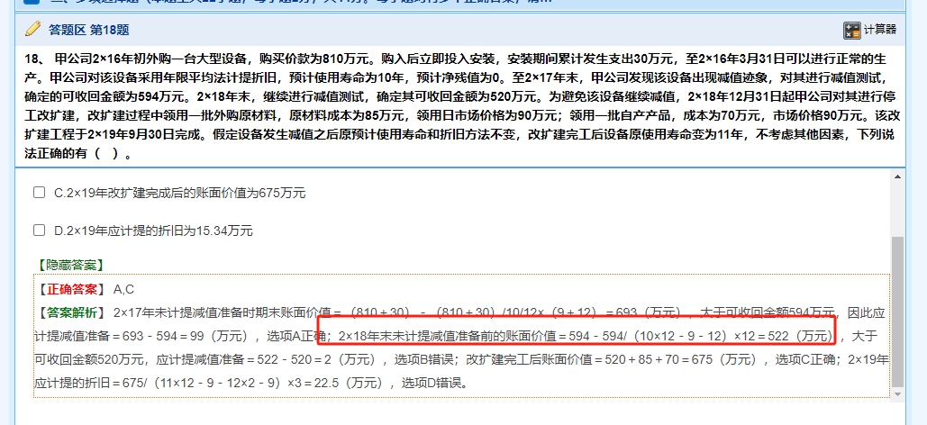 第一步:先明确2×17年末减值后的核心数据<br> <br>- 设备初始入账价值:810 + 30 = 840万元<br><br>- 2×16年折旧(4月-12月,共9个月):<br><br>840/109/12 = 63 万元<br><br><br>- 2×17年折旧(全年12个月):<br><br>840/10 = 84 万元<br><br><br>- 到2×17年末累计折旧:63 + 84 = 147 万元<br><br>- 2×17年末账面价值:840 - 147 = 693 万元<br><br>- 可收回金额为594万元,所以计提减值693 - 594 = 99 万元,减值后账面价值变为594万元<br> <br> <br> <br>第二步:计算2×18年的折旧额(关键是剩余使用寿命)<br> <br>原预计使用寿命是10年(10 12 = 120 个月),到2×17年末已经使用了:<br>9(2×16年)+ 12(2×17年)= 21个月<br> <br>所以剩余使用寿命 = 120 - 21 = 99 个月<br> <br>2×18年全年是12个月,因此2×18年折旧额为:<br><br>594/99 12 = 72 万元<br><br> <br> <br> <br>第三步:计算2×18年末未计提减值前的账面价值<br> <br>用2×17年末减值后的账面价值,减去2×18年折旧额:<br><br>594 - 72 = 522万元<br><br> <br> <br> <br>第四步:判断B选项的对错<br> <br>2×18年末可收回金额是520万元,所以应计提减值准备 = 522 - 520 = 2 万元<br>如果B选项的内容是“2×18年末应计提减值准备为0”这类错误说法,那B就是错的✅