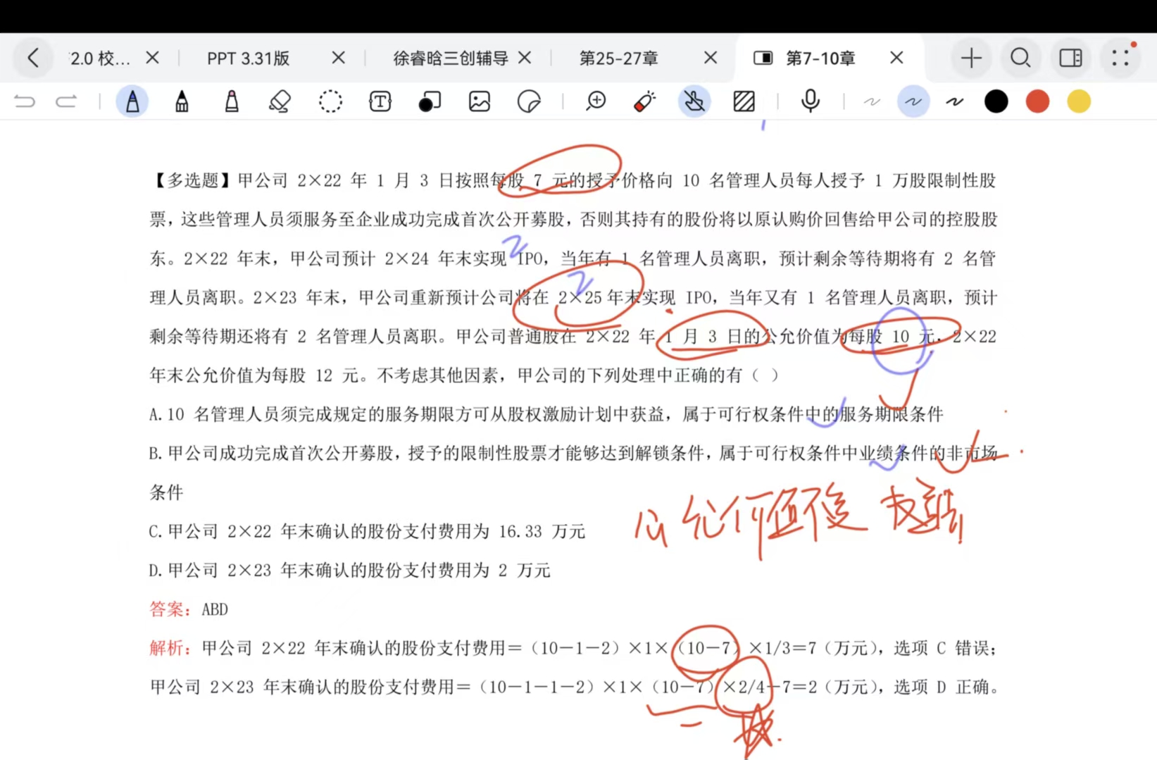 第十章提问 为什么是10-7呢? 因为我理解的是,10就是授予日的公允价值为什么不直接用10呢?而且前面的例题就是直接用的公允价值