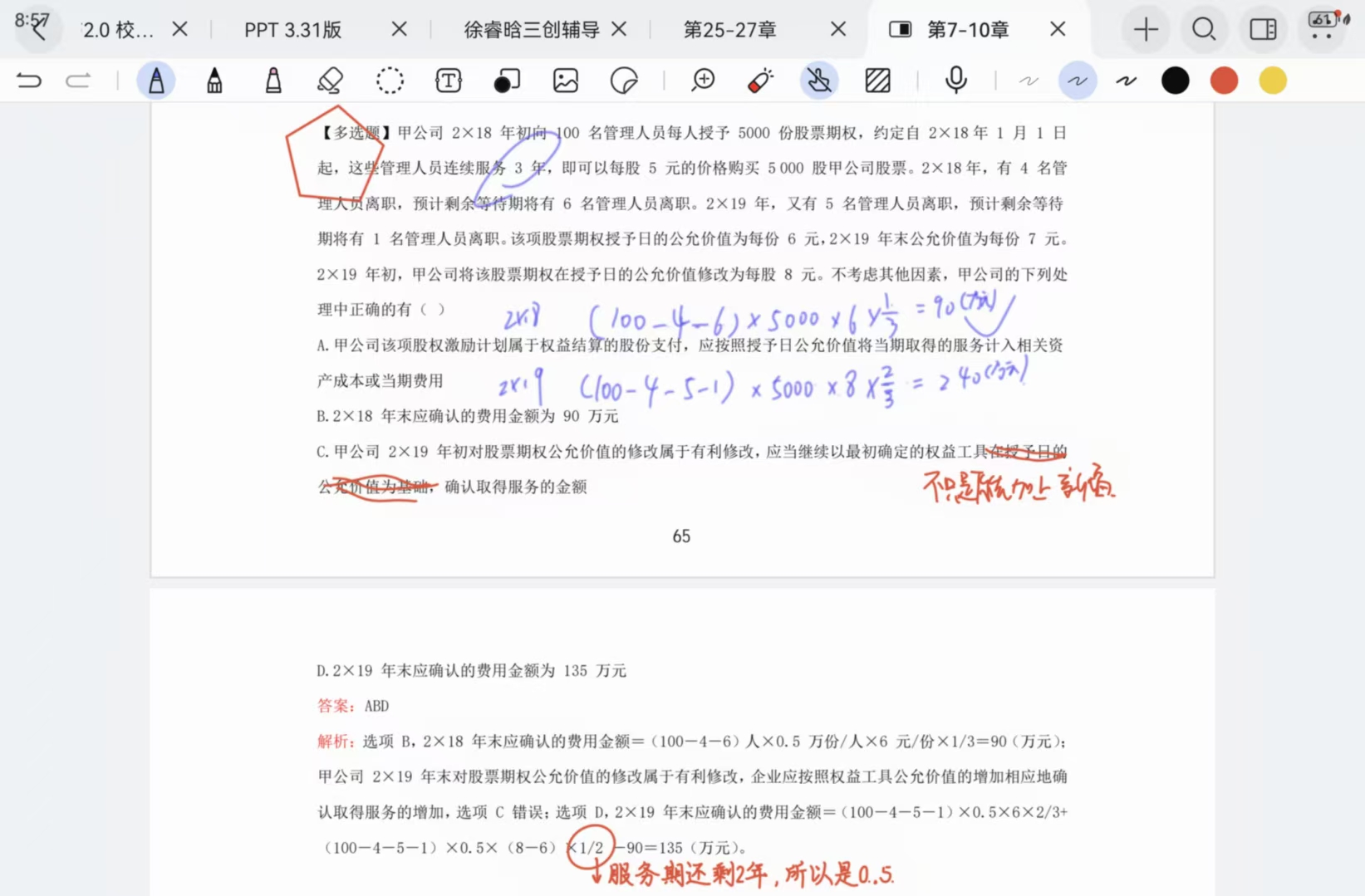 <p>是的,公允价值增加后,<strong>增加的部分需要重新计量</strong>,但只对<strong>尚未确认的服务费用</strong>部分进行调整。</p><br><p>这个知识点在《企业会计准则第11号——股份支付》中规定:</p><br><blockquote><br><p><strong>对于权益结算的股份支付,在等待期内每个资产负债表日,应按授予日公允价值为基础,根据预计可行权的权益工具数量和已服务时间确认成本。若后续公允价值上升,属于有利修改,应以修改后的公允价值为基础,重新计算剩余期间应确认的费用。</strong></p><br></blockquote><br><p>讲义中的表述通常是:</p><br><blockquote><br><p>“公允价值增加属于有利修改,应按照修改后的公允价值与原公允价值的差额,<strong>在剩余等待期内</strong>分摊确认额外的服务成本。”</p><br></blockquote><br><p>所以你看到的“分开计算”,是因为:</p><br><ul><br><li>一部分是原公允价值(6元)对应的累计费用;</li><br><li>另一部分是新增公允价值(8-6=2元)带来的额外费用,需在剩余服务期(2年)内摊销。</li><br></ul><br><p>这正是教材中强调的“<strong>增量费用按剩余等待期分摊</strong>”。</p><br>