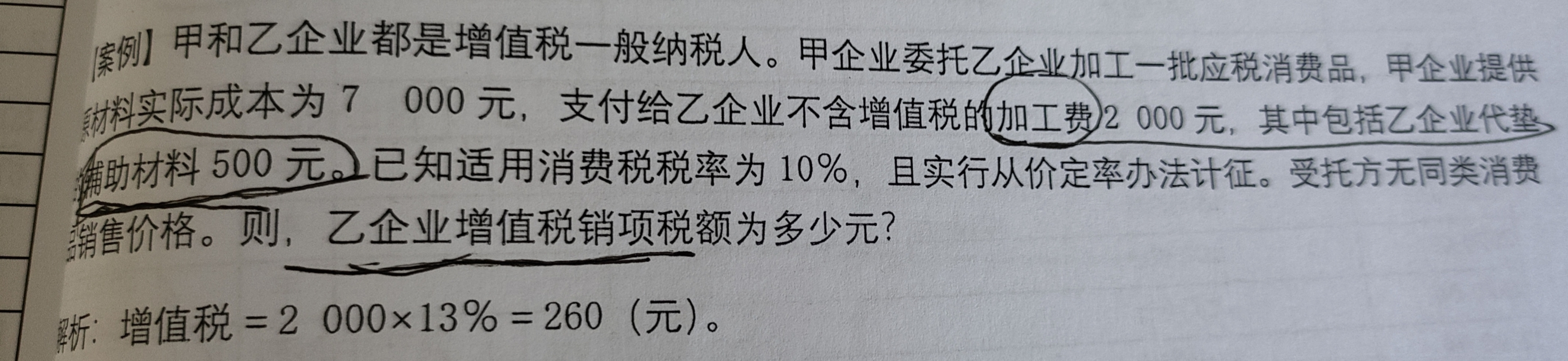 不用对代垫的辅助材料单独做特殊处理哦✅<br> <br>原理说明<br> <br>在受托加工业务里:<br> <br>- 乙企业作为受托方,收取的2000元加工费(包含代垫的500元辅助材料),属于含税/不含税的加工劳务全部价款。<br><br>- 根据增值税规定,受托加工的销售额是指纳税人发生应税销售行为向购买方收取的全部价款和价外费用,代垫的辅助材料费用属于加工劳务的组成部分,已经包含在2000元的加工费里了,不需要再额外单独计税,直接以2000元(注意区分是否含税,含税的话要先做价税分离)作为计税依据计算增值税即可。