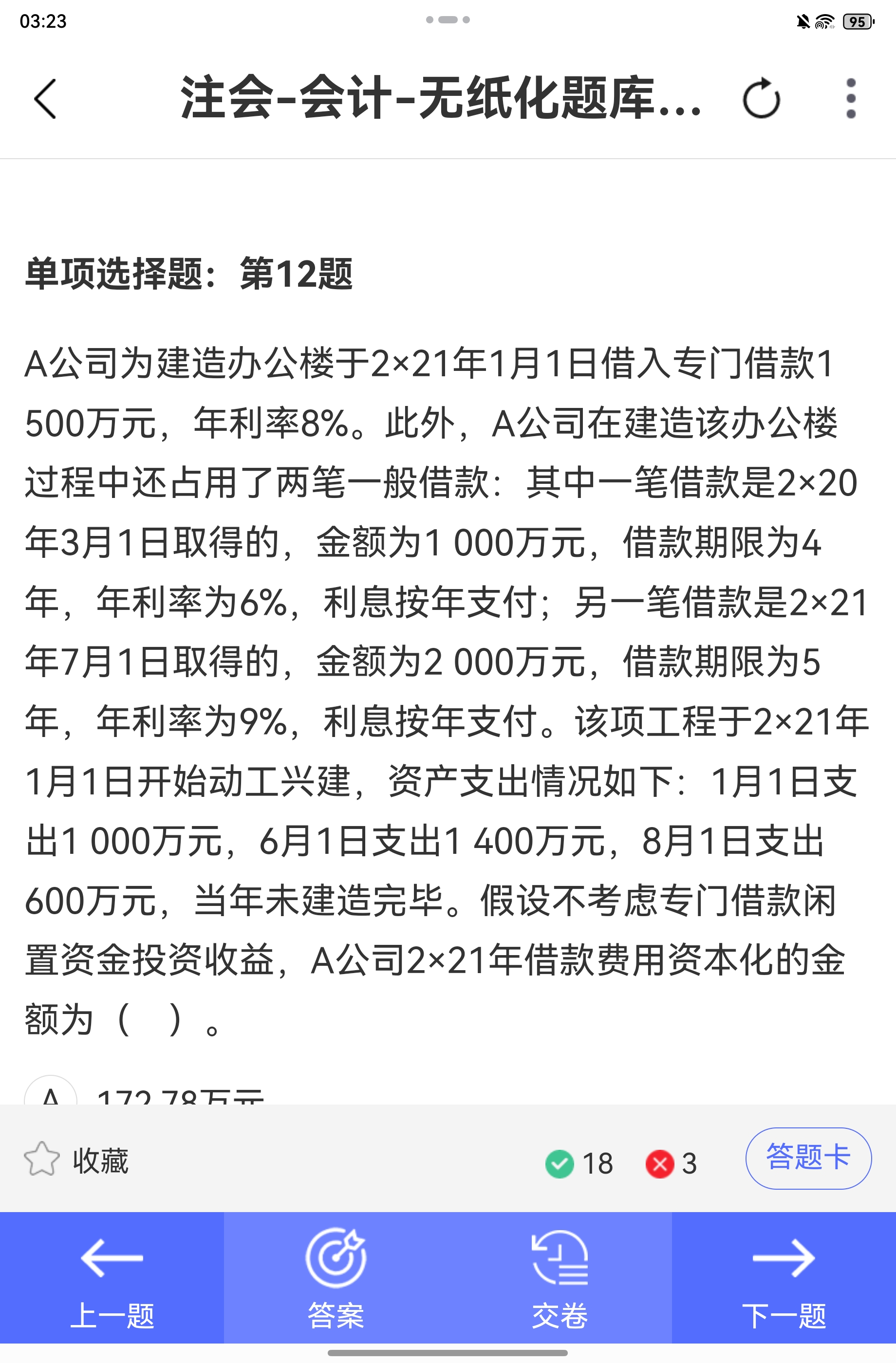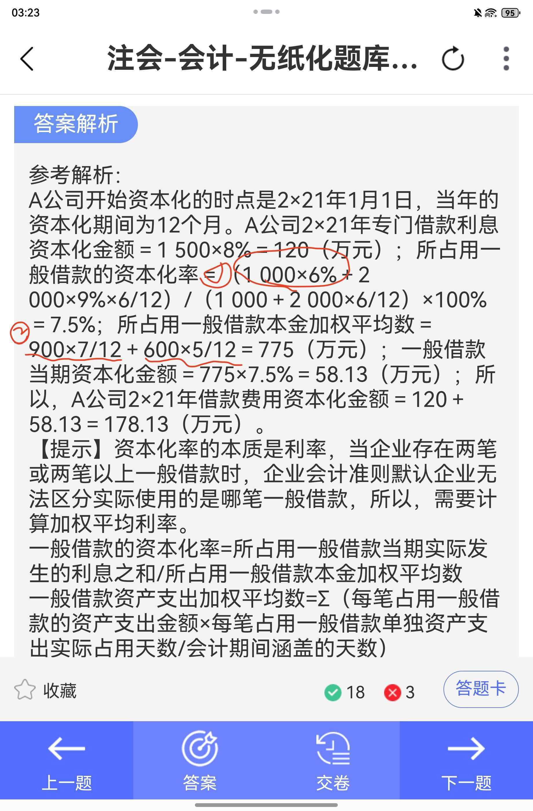 疑问①:为什么1000 6% 后面没有再10/12?<br> <br>这笔一般借款是2020年3月1日取得,在2021年全年都是存续的(整个2021年12个月都在计息),所以2021年它的实际利息就是1000 6%,不需要再乘以时间权重。<br> <br>如果是计算它在2020年的利息,才需要10/12(3月1日到12月31日共10个月),但本题是计算2021年的资本化率,所以这笔借款在2021年是全年计息的✅。<br> <br> <br> <br>疑问②:为什么资本化率的分母是1000 + 2000 6/12,而不是1000 10/12 + 2000 6/12?<br> <br>- 第一笔一般借款(1000万,年利率6%):2020年3月1日取得,2021年全年存续,所以本金加权就是1000 12/12 = 1000。<br><br>- 第二笔一般借款(2000万,年利率9%):2021年7月1日取得,2021年只存续了6个月(7月1日到12月31日),所以本金加权是2000 6/12。<br> <br>所以分母的本金加权平均数 = 1000 + 2000 6/12,而不是你想的1000 10/12,因为10/12是它在2020年的存续时间,不是2021年的。<br> <br> <br> <br>疑问③:为什么资产支出加权平均数是900 7/12 + 600 5/12?<br> <br>首先,先算专门借款的占用情况:<br>专门借款是1500万,2021年1月1日支出1000万,6月1日支出1400万。<br> <br>- 1月1日的1000万:全部用专门借款。<br><br>- 6月1日的1400万:专门借款还剩1500-1000=500万,所以占用一般借款1400-500=900万,这笔900万从6月1日到12月31日,共占用7个月,所以权重是7/12。<br><br>- 8月1日的600万:专门借款已经用完,全部占用一般借款,从8月1日到12月31日,共占用5个月,所以权重是5/12。<br> <br>因此资产支出加权平均数 = 900 7/12 + 600 5/12 = 775(万元)✅