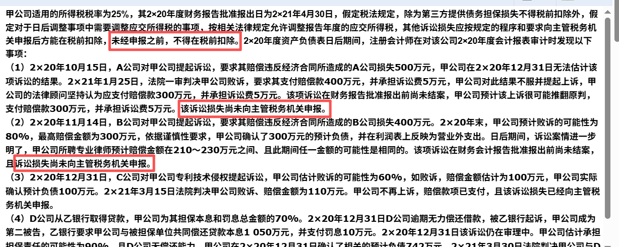 题干中明确说了诉讼损失再未申报之前不得在税前扣除,且事项(1)和(2)也说了尚未向税务机关申报,那不就说明事项1和2不得在税前扣除吗?不得在税前扣除得话,那就不应该确认递延所得税才对吧?因为不得税前扣除得话,预计负债的账面价值和计税基础应该是相等的,因此不会产生递延所得税资产或者负债,这是我的理解。但是后面的答案解析,还是正常确认或者转回递延所得税资产。这是为什么?这不就跟题干不符了吗?不应该有递延所得税才对吧?
