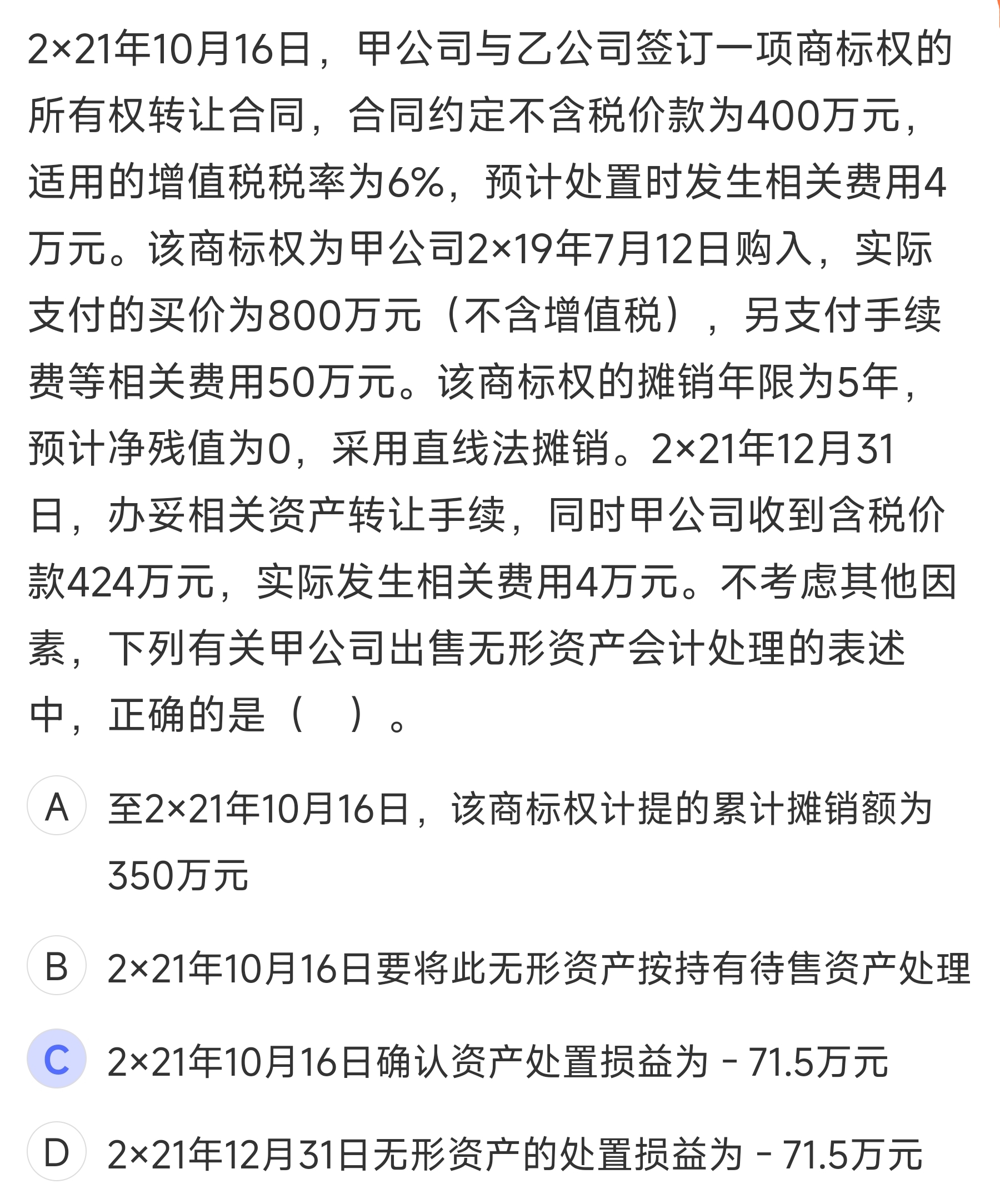 10 月签合同不处置,12 月办完手续才确认损益;处置损益 = 含税价 424 - 成本 850 - 摊 350 - 费用 4=-71.5