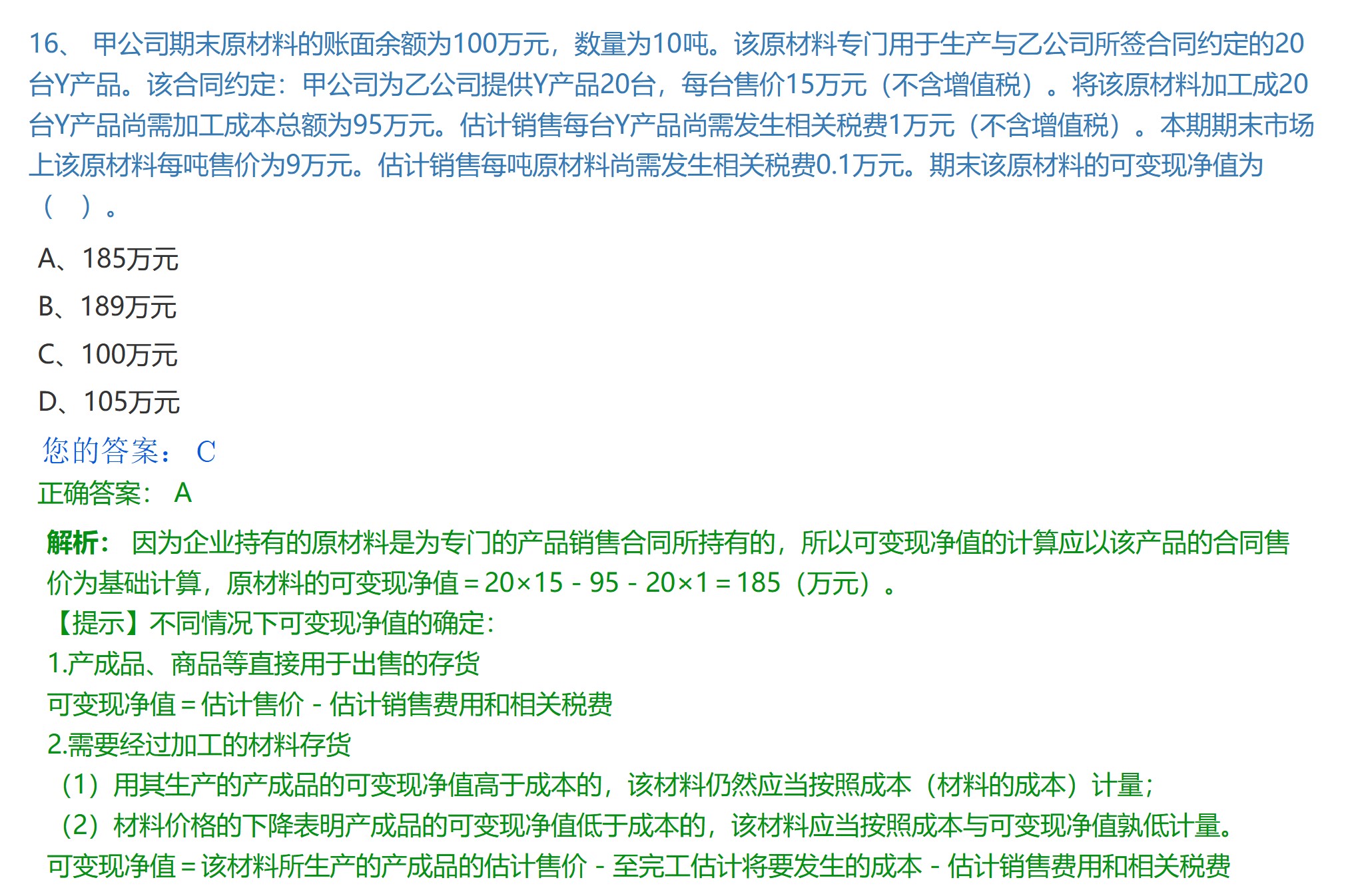 产品未减值时,原材料按成本计量,但题目问的是原材料的可变现净值,不是期末账面价值,故按公式算出185万。