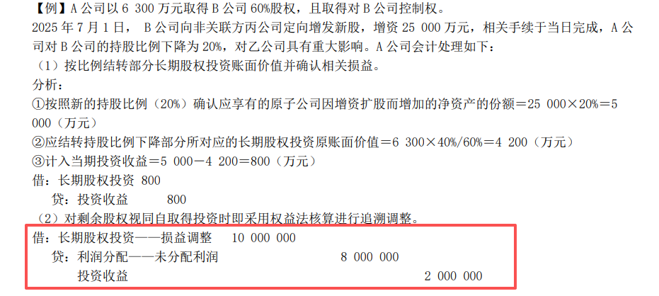 一、先拆解分录逻辑<br>子公司增资后,剩余20%股权要追溯调整为权益法。按持股比例补记原持股期间的净利润,以前年度利润调留存收益,当年利润调投资收益,合计1000万。<br><br><br>二、金额计算与原理详解<br> 1. 核心规则<br>成本法转权益法时,剩余股权需视同自取得投资时就采用权益法核算,对原持股期间(从取得投资日到增资日)子公司的所有者权益变动,按剩余持股比例(20%)追溯调整:<br>- 子公司以前年度实现的净利润:调整「利润分配——未分配利润」(留存收益)<br>- 子公司增资当年实现的净利润:调整「投资收益」(当期损益)<br>- 两者合计,对应调整「长期股权投资——损益调整」<br><br> 2. 本笔分录的金额推导<br>分录中:<br>- 借方:长期股权投资——损益调整 10,000,000元(=1000万元)<br>- 贷方:利润分配——未分配利润 8,000,000元(=800万元)<br>- 贷方:投资收益 2,000,000元(=200万元)<br><br>计算逻辑:<br>1. 剩余持股比例为20%,追溯调整的总损益=子公司原持股期间累计净利润 × 20% = 1000万元<br>2. 其中:<br> - 子公司以前年度(增资前的以前年度)实现的净利润×20% = 800万元 → 计入「利润分配——未分配利润」<br> - 子公司增资当年(2025年1-6月)实现的净利润×20% = 200万元 → 计入「投资收益」<br>3. 题目未直接列示净利润,是因为这是例题的标准追溯模板:通常默认子公司累计净利润为5000万元(5000×20%=1000万),其中以前年度4000万(4000×20%=800万)、当年1000万(1000×20%=200万),符合8:2的常见拆分。<br><br>- 以前年度的损益已经结转到留存收益,不能再影响当期利润,所以调整「未分配利润」<br>- 增资当年的损益属于当期,所以调整「投资收益」,不影响留存收益<br><br><br> 三、补充提示<br>如果题目给出具体净利润,直接按以下公式计算即可:<br>- 追溯调整总金额 = 子公司自A公司取得投资日至2025年7月1日的累计净利润 × 20%<br><br> 以前年度 = 子公司2025年以前年度累计净利润 × 20% → 贷:利润分配——未分配利润<br> 2025年1-6月部分 = 子公司2025年1-6月净利润 × 20% → 贷:投资收益